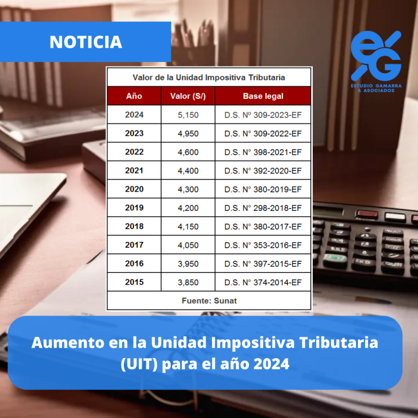 Según el Decreto Supremo N°309-2023-EF, la UIT se establece en S/ 5,150.00 para el 2024, lo que representa un incremento de S/200.00 en comparación con el valor del 2023.